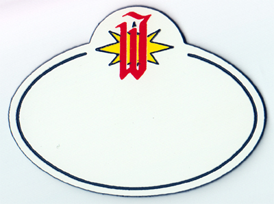 (This is the first version of this nametag. The red border is painted on, later versions have the border engraved into the plastic.) |