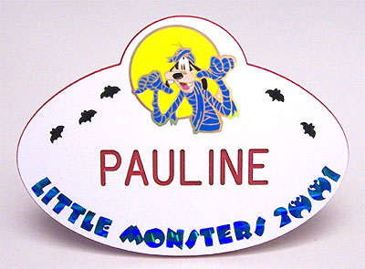 | Nametag used for Little Monsters on Main Street in 2001. | Nametag used for Little Monsters on Main Street in 2002. |
