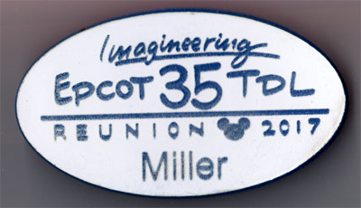 | Nametag worn by Imagineers atttending the reunion of those who worked on the original EPCOT and Tokyo resorts in 2017. |